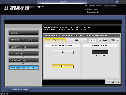 [Intervalo de sondeo] | Configure el intervalo de ajuste de fecha/hora conectándose cada cierto tiempo al servidor NTP. Establece el intervalo para el ajuste de fecha y hora mediante la conexión periódica al servidor NTP con el Teclado del Panel de control. Rango: de 1 a 240 horas | |