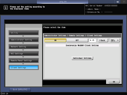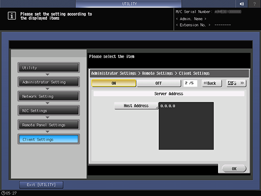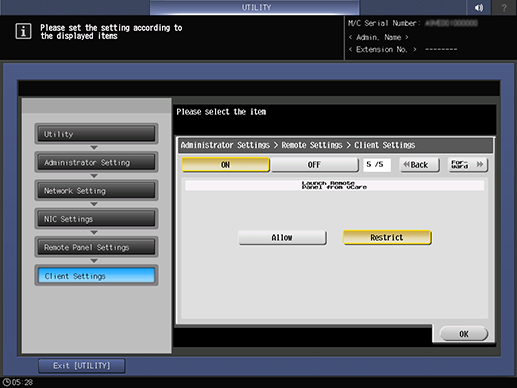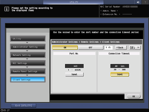 [Tiempo espera para conexión] | Si transcurre el periodo de tiempo especificado sin que se realice ninguna operación durante la conexión con el sistema cuando se utiliza el panel remoto, la conexión se interrumpe. Pulse [Introducir] e introdúzcalo con el Teclado del Panel de control. Rango: 20 a 300 seg. | |