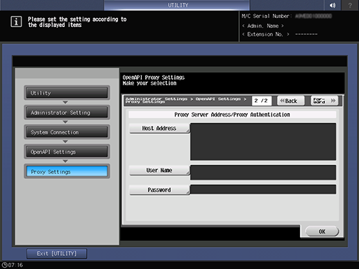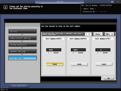 [Número puerto (HTTP)] | [Introducir] | Permite definir el número de puerto (HTTP) del servidor proxy. Para la introducción, utilice el Teclado del Panel de control. Rango: de 1 a 65535 |