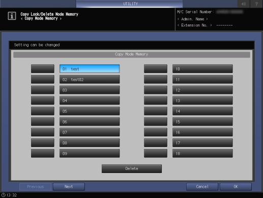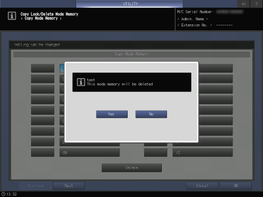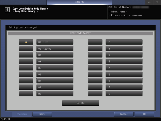 [Bloq./borrar memoria modo] | [Memoria del modo Copia] | Bloquea o desbloquea para evitar que se eliminen las opciones [Memoria del modo Copia], [Memoria del modo Escaneado], y [Almacenar memoria modo] registradas por la función de programa. También puede eliminar el programa desbloqueado. Para obtener más información sobre la función del programa, consulte Modo Memoria. |