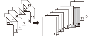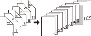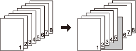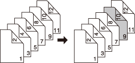 [2->1] | Se inserta papel en blanco después de que la quinta hoja (páginas novena y décima) de un original a 2 caras se haya copiado en modo de impresión normal. No puede insertarse papel en blanco después de una página de copia con un número impar. ![]() |