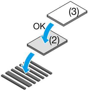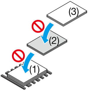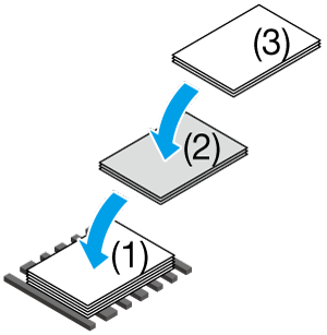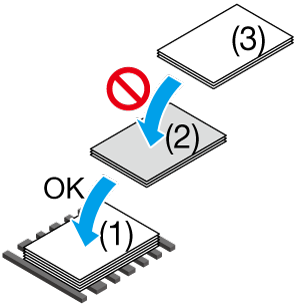 Esta función permite superponer el papel de la tarea que va después de la siguiente tarea de impresión (3) sobre el papel de la siguiente tarea de impresión (2); antes quite el papel de la tarea (1) que ya se ha superpuesto en el apilador (cuando está ajustado el estado de más arriba). ![]() | |