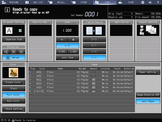 [Papel automático] | Activa la función Papel automático. La bandeja de papel se selecciona automáticamente para ajustarse al tamaño del original y el porcentaje de zoom definido. Para desactivar la función, vuelva a pulsar esta tecla. |
