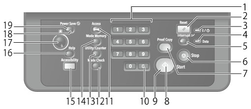 11 | Acceso | Si se pulsa esta tecla mientras se ejecuta una operación con autenticación de usuario o seguimiento de cuenta activos, la operación se interrumpe. Cuando se requiere autenticación de usuario o seguimiento de cuenta, se visualiza la pantalla de autenticación y el sistema deja de estar disponible hasta que se vuelva a realizar la autenticación. |