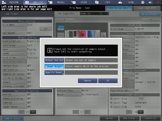 [Salida hojas] | Visualiza una muestra sobre la hoja que aparece en la pantalla de vista previa. |