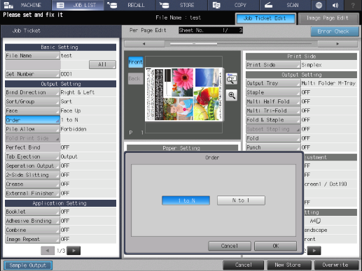 Para disponer las páginas en orden inverso, asigne a [Cara] el valor [Cara arriba] y a [Orden] el valor [1 a N]. Las impresiones se apilan según el orden de las páginas.