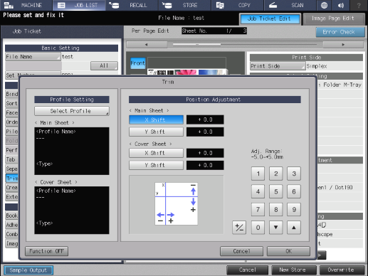 [< Hoja de portada >] | [Desplazamiento X] | Ajusta la cantidad de desplazamiento del eje X en la portada. El valor de configuración definido se muestra en el campo de visualización de valor de ajuste de la cantidad de desplazamiento junto a [Desplazamiento X]. Rango: de -5,0 mm a 5,0 mm | |