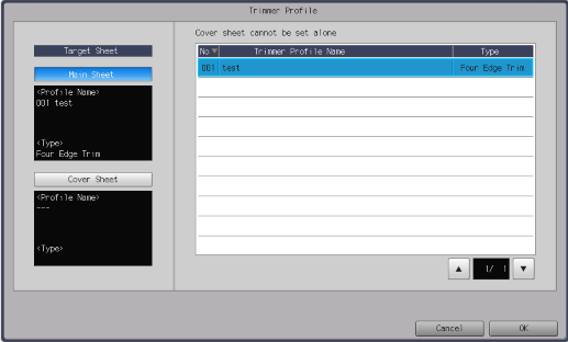 [Configuración del perfil] | [Seleccionar perfil] | Gestiona el perfil de recorte que va a ajustarse para la [< Hoja principal >] y la portada [< Hoja de portada >]. | |