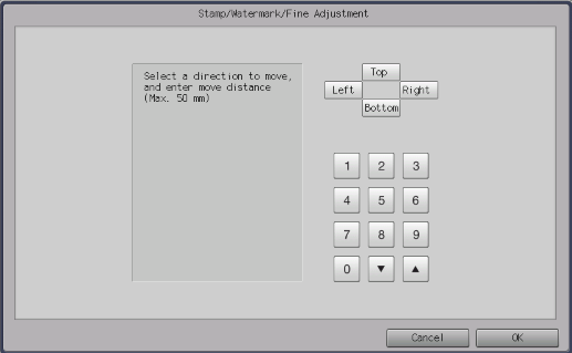 [Im. juego pos.] | [Ajuste fino] | Introduzca el valor numérico para ajustar la posición de impresión de la marca. |