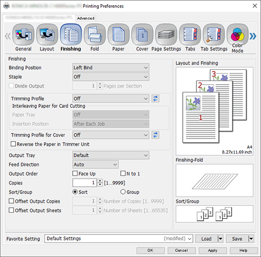 Defina la dirección de encuadernación y la bandeja de salida, así como el procesamiento de acabado, como grapado, perforado y plegado.