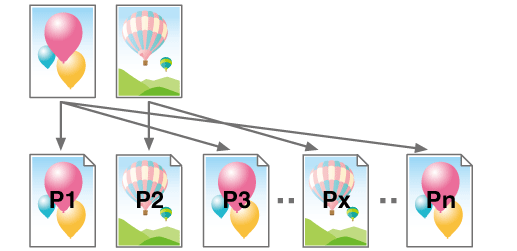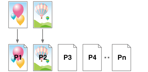 Ejemplo: cuando se imprimen 2 páginas de formulario utilizando [Una vez], la página 1 del formulario se asigna a la 1.ª página de la tarea, la página 2 del formulario se asigna a la 2.ª página de la tarea y después ya no se asigna ninguna página del formulario al resto de las páginas, como se muestra a continuación.
