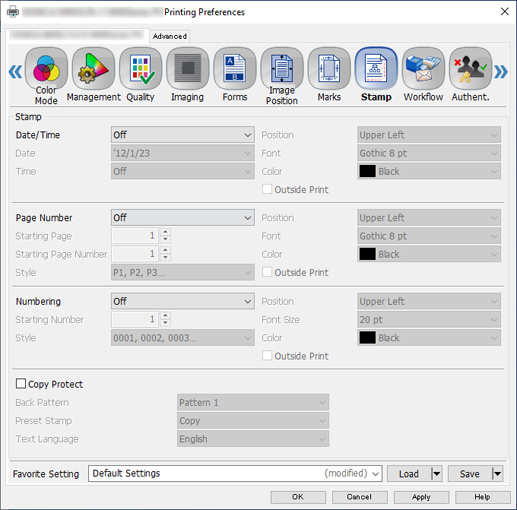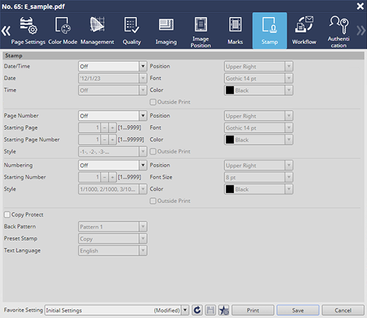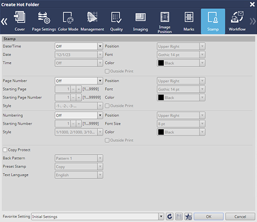 Permite configurar los ajustes para imprimir información que no está en el original ([Fecha/Hora]/[Número de página]/[Enumeración]).