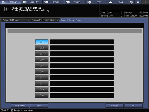 [Recuperar] | Recupera el color registrado por el usuario. Seleccione y ajuste la tecla del número de registro que desee recuperar. Resulta práctico poder seleccionar inmediatamente el color de papel necesario. |