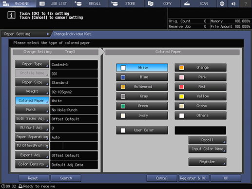[Registrar] | Seleccione esta función para registrar o eliminar de forma arbitraria el nombre del color de papel que se va a cargar en una bandeja o el papel de un perfil de papel registrado. |