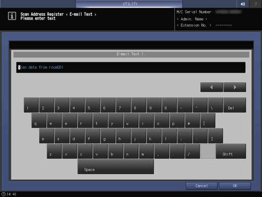 Panel de control - Utilidades/Contadores - [Conf. de administrador] - [Dirección envío escaneado] - [Config.txt. corr. electr.]