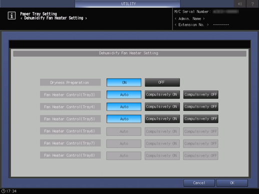 [Desactivado]: No realiza la preparación de secado del calentador del ventilador de aire caliente deshumidificador si no se cambia la cantidad restante de papel después de abrir o cerrar la bandeja de papel.