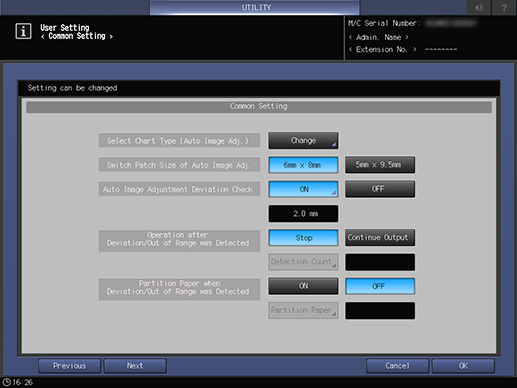 [Comprobación desviac.ajus.auto. imagen]*2*3 | Permite especificar si debe revisarse o no una desviación automáticamente. Rango: de 0,5 mm a 10,0 mm | |