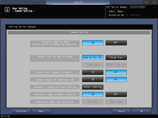[Crear informe inspección automática]*3 | Configure el ajuste para crear un informe de resultados de inspección automática. Si el papel de salida que no cumple el estándar no se expulsa automáticamente, el usuario procesará el papel de salida no estándar según el informe. | |