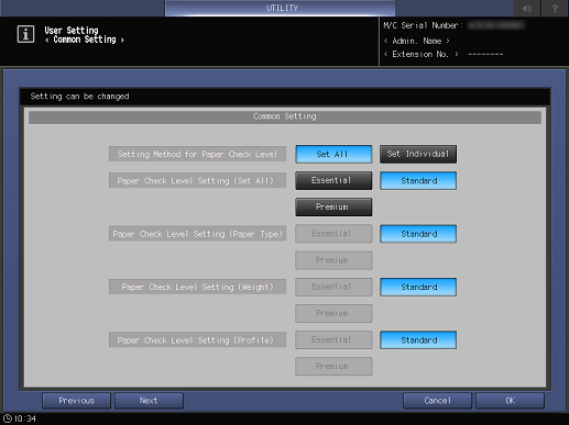 [Método config. nivel compr. papel] | Seleccione el método para configurar el estándar de inspección para la comprobación de papel. * Si se selecciona [Configurar todo], las siguientes opciones no pueden ajustarse individualmente. Se ajustan automáticamente al estándar de inspección de [Aj. nivel compr. papel (Config. todo)].