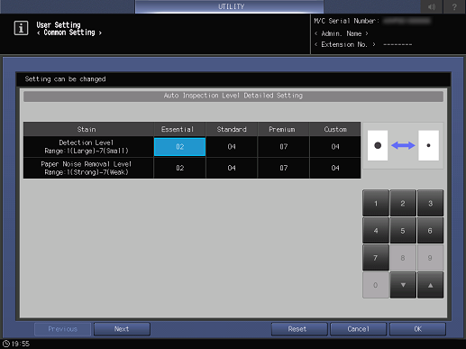 En AccurioPro Print Manager o Controlador de plugin PS pueden fijarse los niveles de inspección de [Essential] a [Premium]. Para obtener más información, consulte [Calidad].