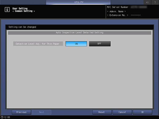Las inspecciones de [Trazo] (manchas de rayas) o [Punto] (manchas circulares) y [Aj. nivel de detección de papel fino] son funciones opcionales. Estas funciones no se visualizan de manera predeterminada. Para utilizar esta configuración, póngase en contacto con el servicio de asistencia técnica.