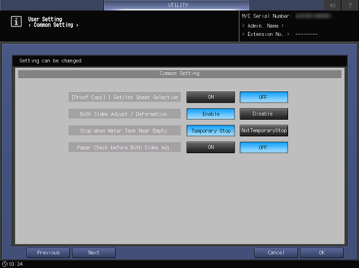[Parada con depósito de agua casi vacío] | Permite definir si desea o no detener temporalmente una impresión cuando baje el nivel de agua en el depósito humidificador. Aparece cuando está instalada la Unidad de relé RU-518m con el Humidificador HM-103. | |