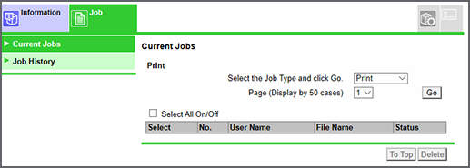 [Seleccione el tipo de trabajo y haga clic en Ir.] | Selecciona el tipo de tarea visualizada de la lista del menú. Es posible seleccionar el deseado entre estas opciones.