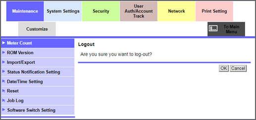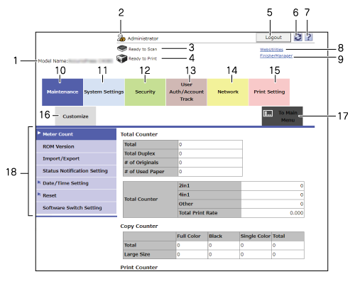 5 | [Cierre de s.] | Si hace clic en este botón, se muestra la pantalla [Cierre de s.] para que pueda cerrar la sesión en el modo administrador. Después de cerrar la sesión, se muestra la pantalla [Inicio de sesión] para que pueda iniciar sesión en otro modo. También puede configurar el periodo de tiempo de espera en el modo administrador. Para obtener más información, consulte [Cierre de sesión auto.]. |