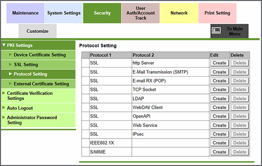 Haga clic en [Registrar] del protocolo asignado al certificado. Para cambiar la asignación, haga clic en [Editar].