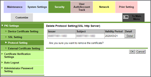 Haga clic en [Eliminar] en el protocolo para cancelar la asignación del certificado.