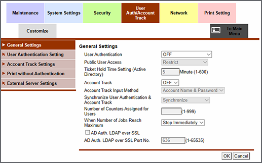 Con [ACTIV. (Servidor externo)], se realiza la autenticación de usuario a través de un servidor externo.