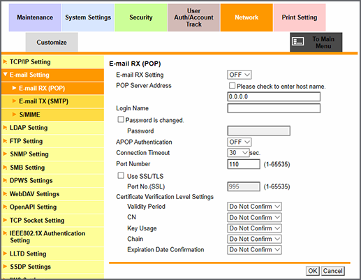 [Número de puerto] | Permite introducir el número de puerto del servidor POP. Rango: de 1 a 65535 | |
