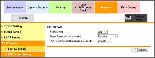 [Restringir comando conexión datos] | [Permitir] | No rechaza la recepción desde un cliente FTP. |