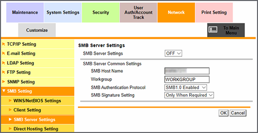 [Nombre de host SMB] | Define el nombre de host del servidor SMB. Se pueden introducir hasta 15 caracteres de un byte. | |