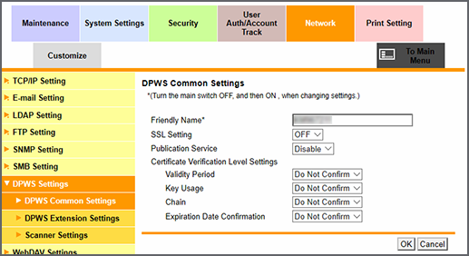 [Servicio de publicación] | [Activar] | Se activa el Servicio de publicación. Permite seleccionar este elemento cuando se desactiva NetBIOS o solo se utiliza IPv6 para la comunicación. |
