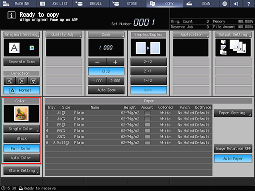 [Couleur auto] | Détection automatique des couleurs de l'original numérisé et impression de l'image en noir et blanc ou en couleur. |