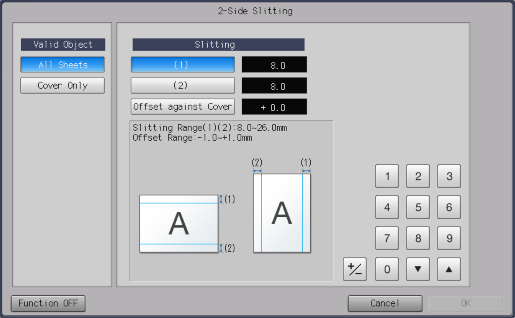 Quand la valeur de massicotage diffère de 10,0 mm ou plus entre [(1)] et [(2)], cette valeur ne peut pas être entrée.