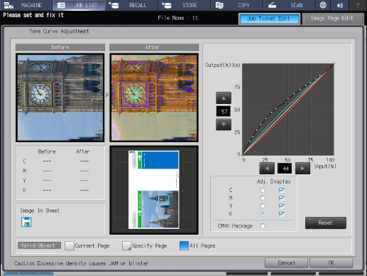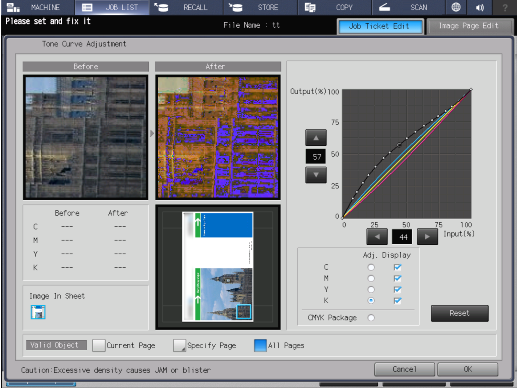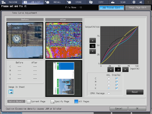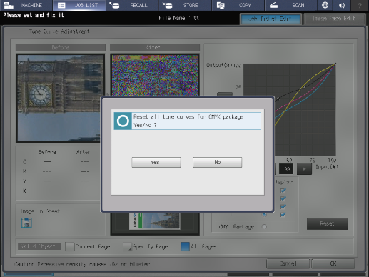 Pour régler des courbes de tonalité collectivement, appuyer sur [Paquet CMJN]. Appuyer sur [Oui] sur la boîte de dialogue de confirmation.