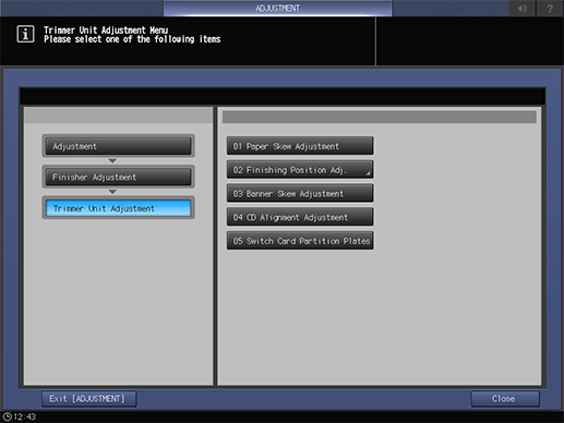 Touch panel - [MACHINE] - [Adjustment] - [Finisher Adjustment] - [Trimmer Unit Adjustment]