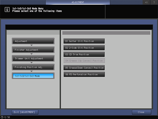 Touch panel - [MACHINE] - [Adjustment] - [Finisher Adjustment] - [Trimmer Unit Adjustment] - [Finishing Position Adj.] - [1x1-1x3/1x1-3x3 Mode]