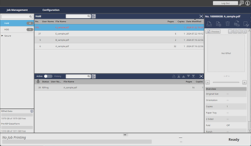 [Pages] | Displays the number of pages in the original. Insertion sheets are not counted. The jobs without RIP for printing are indicated by "-". | |
