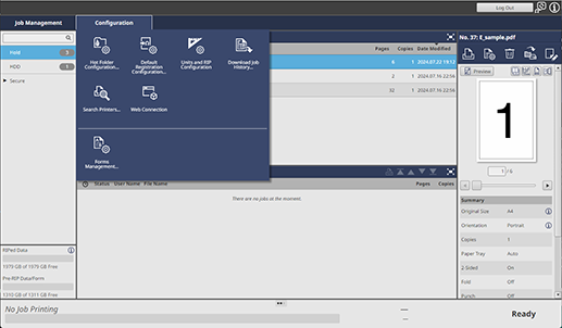Configure settings related to the date/time display format, length unit, and RIP operation for job uploading. | |