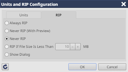[RIP If File Size Is Less Than] | Sets the maximum file size to perform RIP. When the file size is less than the entered size, RIP is performed. |