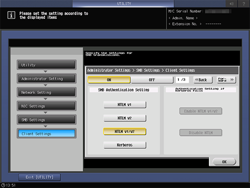 [SMB Authentication Setting] | [NTLM v1] | Selects the SMB authentication format. To use Scan to SMB in Mac OS 10.7 or later, select [NTLM v1/v2]. |