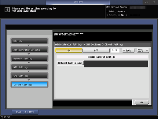 [Single Sign-On Setting] | Set the default domain name. Required for using single sign-on function. Press [Default Domain Name] to enter the default domain name. Up to 64 single-byte characters can be entered. | |