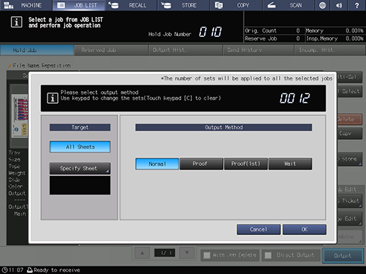 You can set the output method and the number of sets. The jobs to be printed are managed in [Reserved Job].