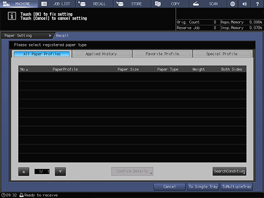 Even if many paper profiles are registered, you can easily recall the target paper profile using the sort function, [SearchCondition], or [Confirm Details].
