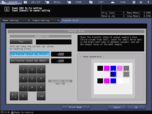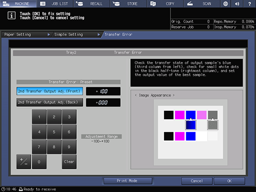 Select [2nd Transfer Output Adj.(Front)] or [2nd Transfer Output Adj.(Back)], and use the on-screen keypad or Keypad of Control panel to enter the optimal adjustment value for the chart selected in step 4.