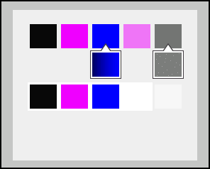- Check the transfer condition of the blue (third row from the left) on the output chart as well as whether there are any small white spots in the black halftone (first row from the right). Set the adjustment value for the chart in the best condition.