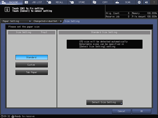 When there is a group of sizes in which there is not much difference in sizes and that is difficult to distinguish with this system, prevent erroneous detection by specifying a single size with [Detect Size Setting].